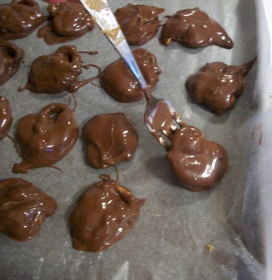 When they're set up, melt the candy coating in a glass bowl on half power in the microwave, stirring often so it doesn't scorch. Using a fork, dip the pretzel in the melted chocolate