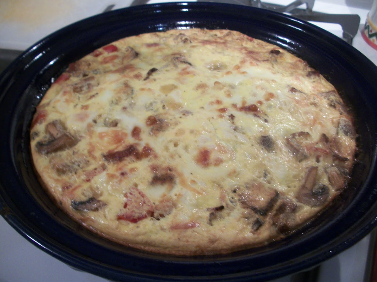 Cook bacon in a large skillet until very crisp. Remove; drain on paper towels. Pour off all but 2 tablespoons fat from skillet. Return skillet to medium-high heat; add onions, mushrooms and red pepper. Cook until well browned, about 4 minutes. Remove from skillet; spread vegetables in a greased 9 or 10 inch pie plate.