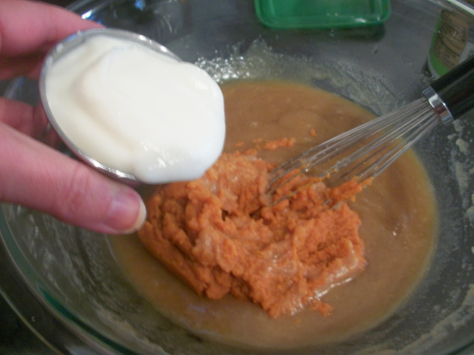 In another large bowl whisk together the melted butter and sugars. Add the egg, then vanilla, yogurt and pumpkin and blend together well with the whisk.